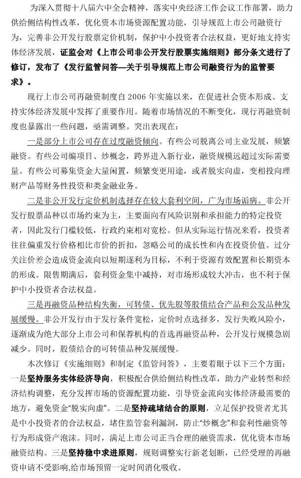 证监会完善上市公司非公开发行股票规则 规范上市公司再融资